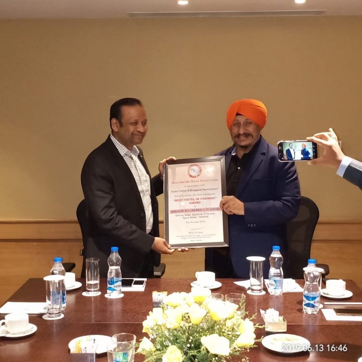 Team HCBA awarded “BEST HOTEL IN CHENNAI AWARD” to Radisson Blu Chennai City Centre, in a impressive investiture ceremony, by Mr. TPS Grrover, Chief Hospitality Blogger,Critic & social media influencer.