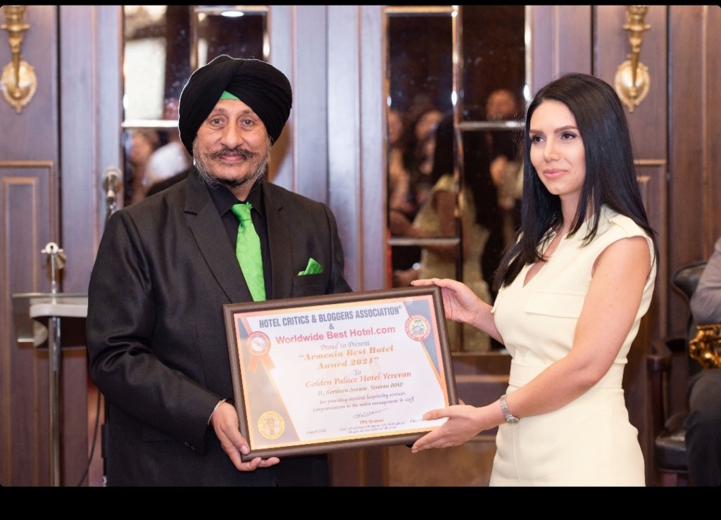 Team HCBA’s founder president Mr. Tps Grrover recently awarded “ARMENIA Best Hotel Award 2021” and “Best Sanitized Hotel Award 2021” to GOLDEN PALACE HOTEL YEREVAN for their outstanding hospitality services, guests friendly staff, superb food, sanitization standards, location etc.