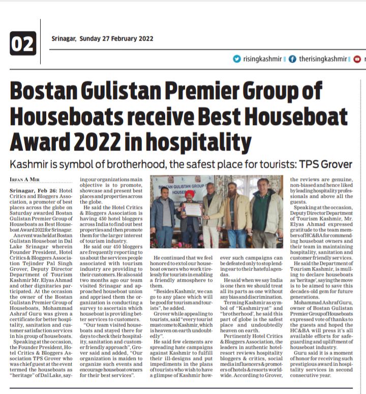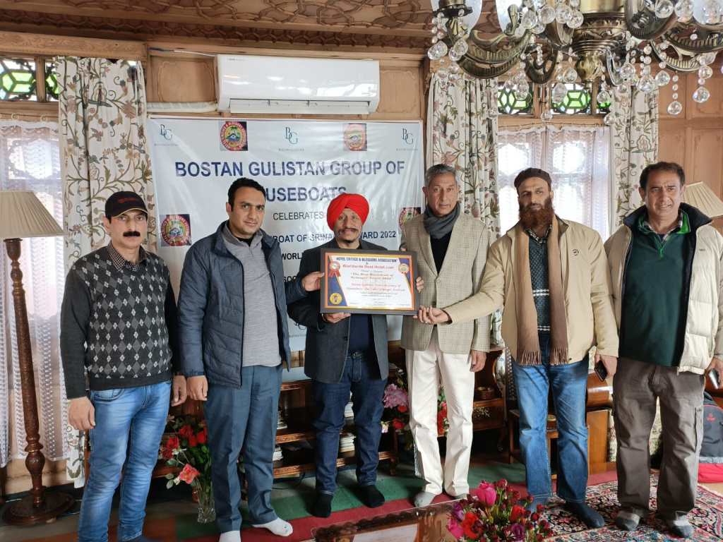 This year Team awarded “Bostan Gulistan group of premium houseboats” with “Srinagar Best Houseboat Award 2022”. The Bostan Gulistan houseboat group’s chairman Mr. Ashraf Guru has received this award for the 2nd successive year and it speaks volume for their overall houseboat hospitality services & standards.