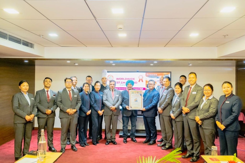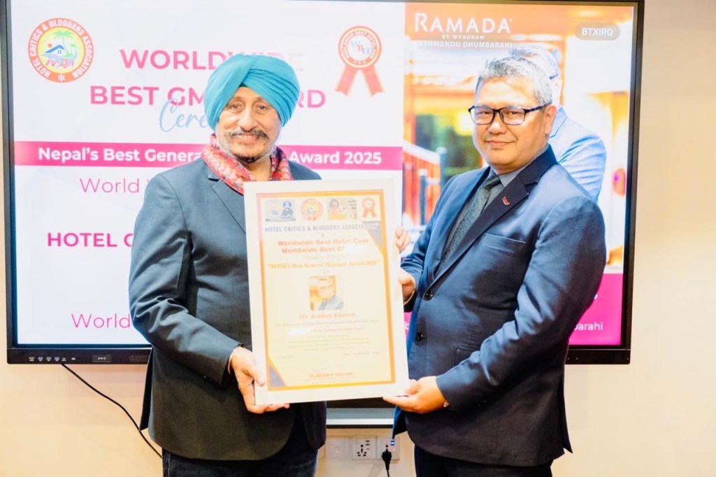 In a grand and prestigious recognition ceremony held in Kathmandu, Mr. Roshan Khawas, General Manager of Hotel Ramada by Wyndham Kathmandu Dhumbarahi, was officially conferred with the “Nepal’s Best General Manager Award 2025” by Mr. Tajinder P. Grover, President of the “Hotel Critics & Bloggers Association” (Team HCBA) and Chairman of “Worldwide Best GM” and “Worldwide Best Hotel”.