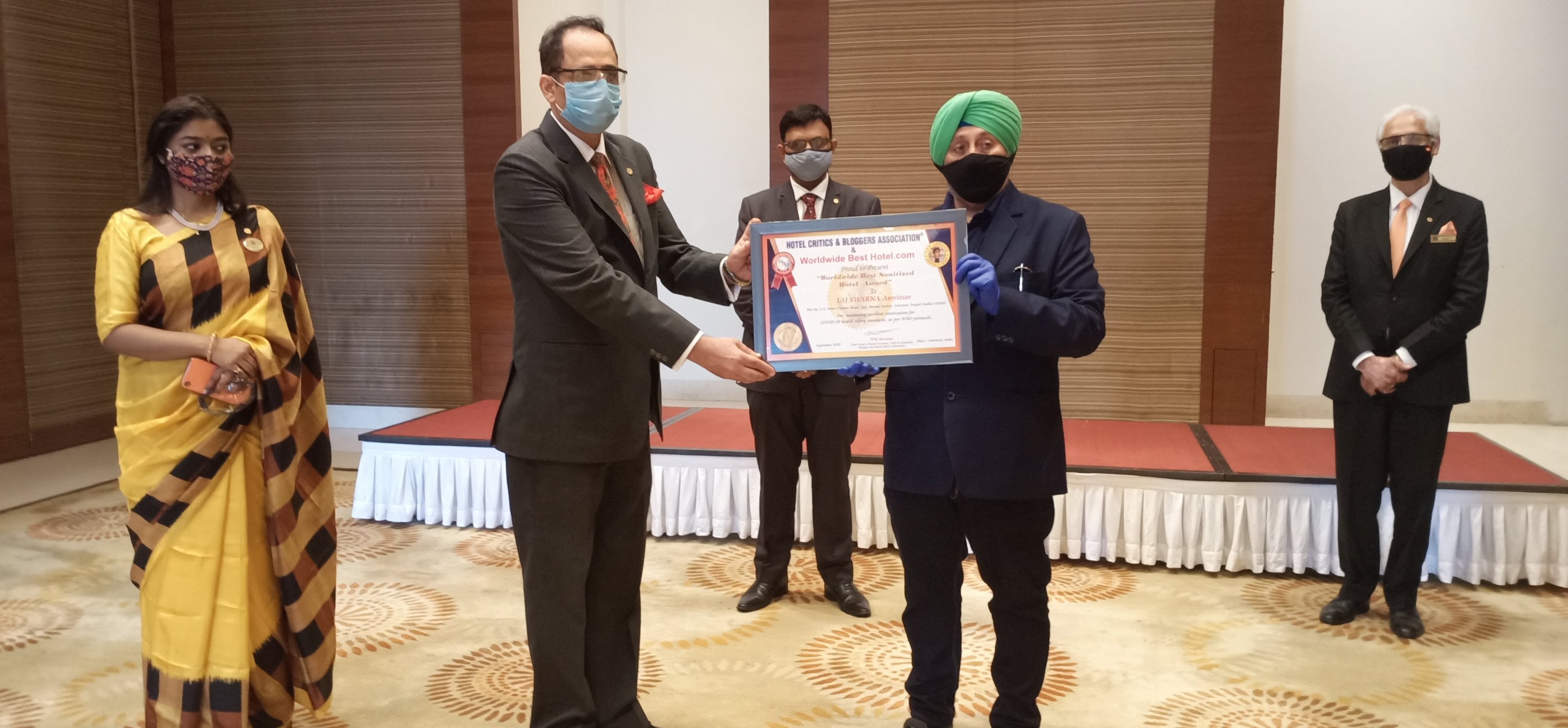 Team HCBA is proud to present “Worldwide Best Sanitized Hotel Award” to India’s leading & most popular chain Taj Hotel’s TAJ SWARNA Amristsar, Punjab, during an impressive ceremony held on 11th September 2020.